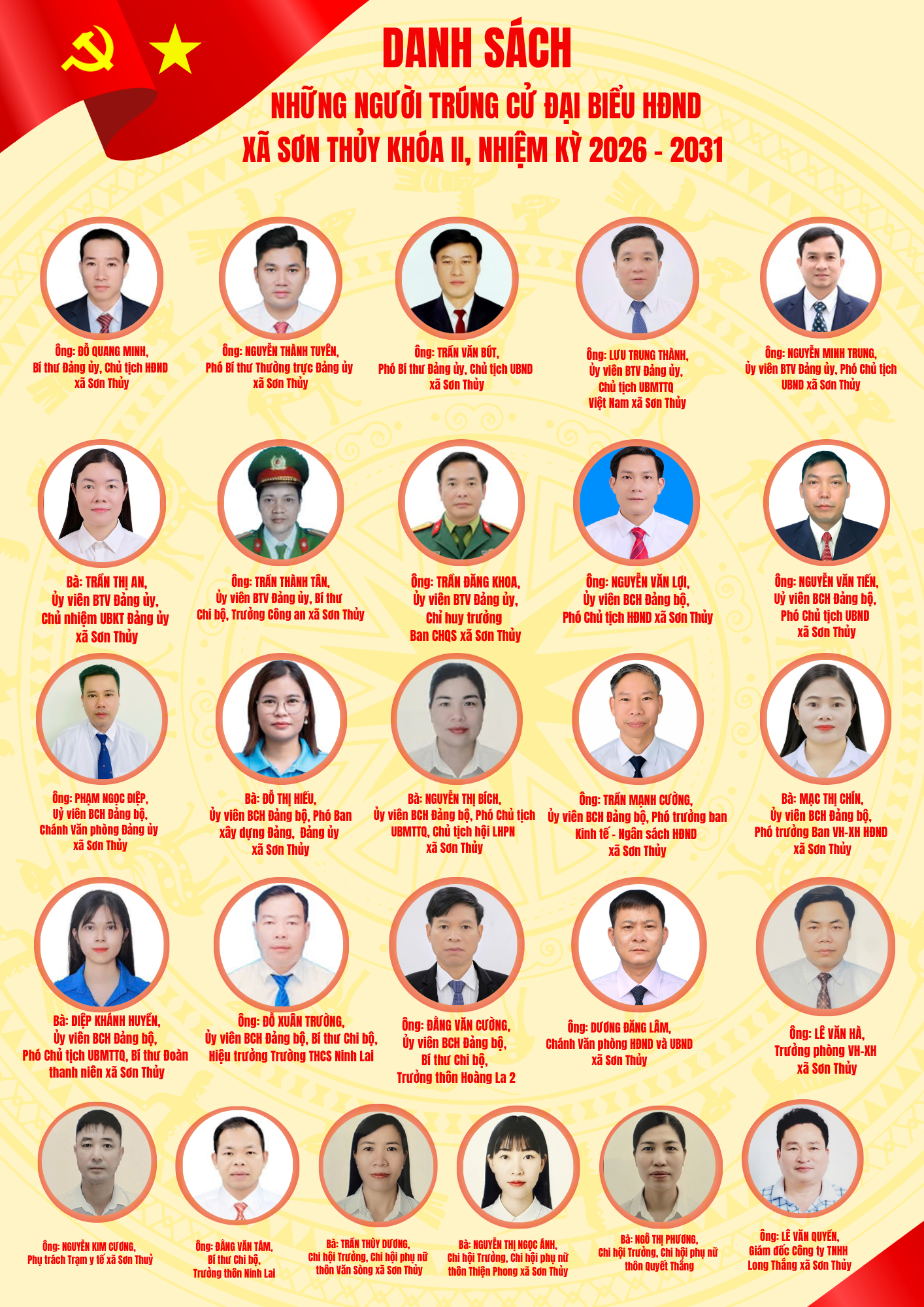 DANH SÁCH NHỮNG NGƯỜI TRÚNG CỬ ĐẠI BIỂU HỘI ĐỒNG NHÂN DÂN XÃ SƠN THỦY KHÓA II, NHIỆM KỲ 2026 - 2031